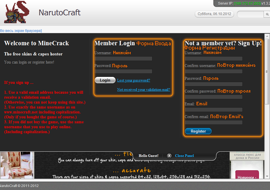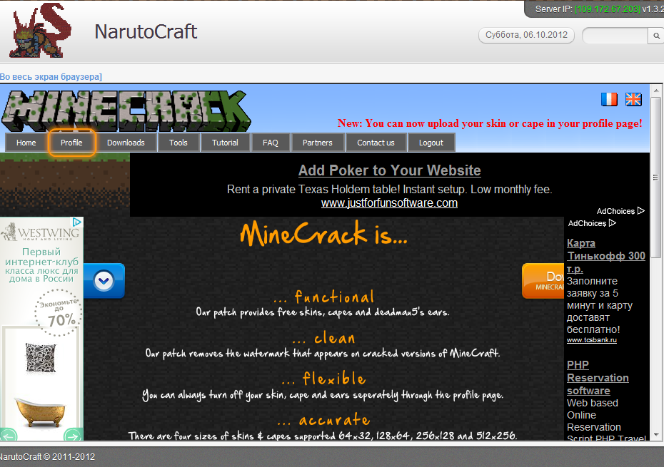 6. На это странице вы можете поменять регистрационные данные вашего профиля (Снова повторяю, профиля не с нашего сервера). А так же установить себе скин, и даже плащ. Нажимаем Кнопку [Обзор...] и находим свой скин у себя на компьютере, жмем ОК, и [Upload].