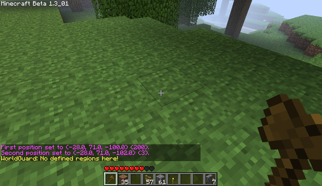 | Чтобы защитить зону, сначала её необходимо выделить. Выделение зоны производится деревянным топором. ![]() Любая зона, выделенная WorldGuard представляет собой Параллелепипед (или кубоид). То есть, он может быть прямоугольный, квадратный, и так далее, но не может быть сложной формы. В игре он выделяется всего двумя точками. На данной картинке этими точками являются A и G.